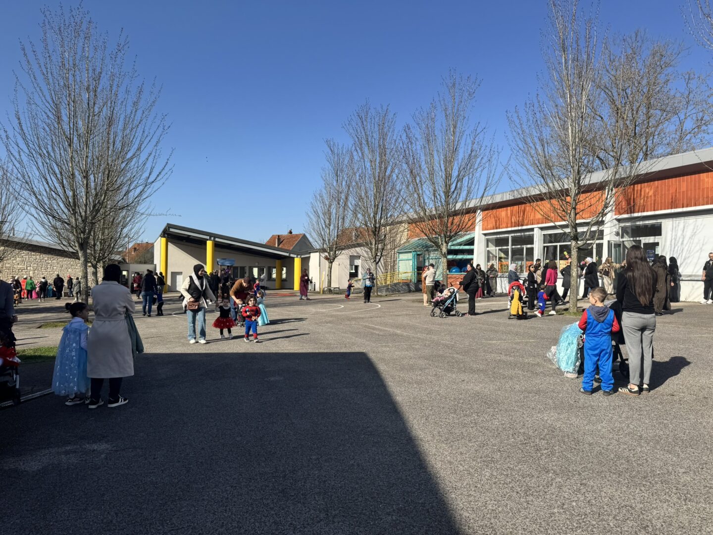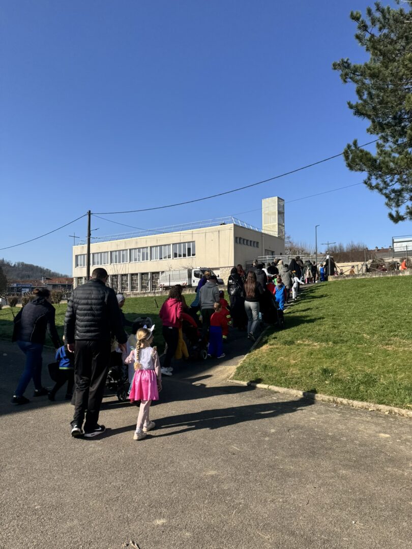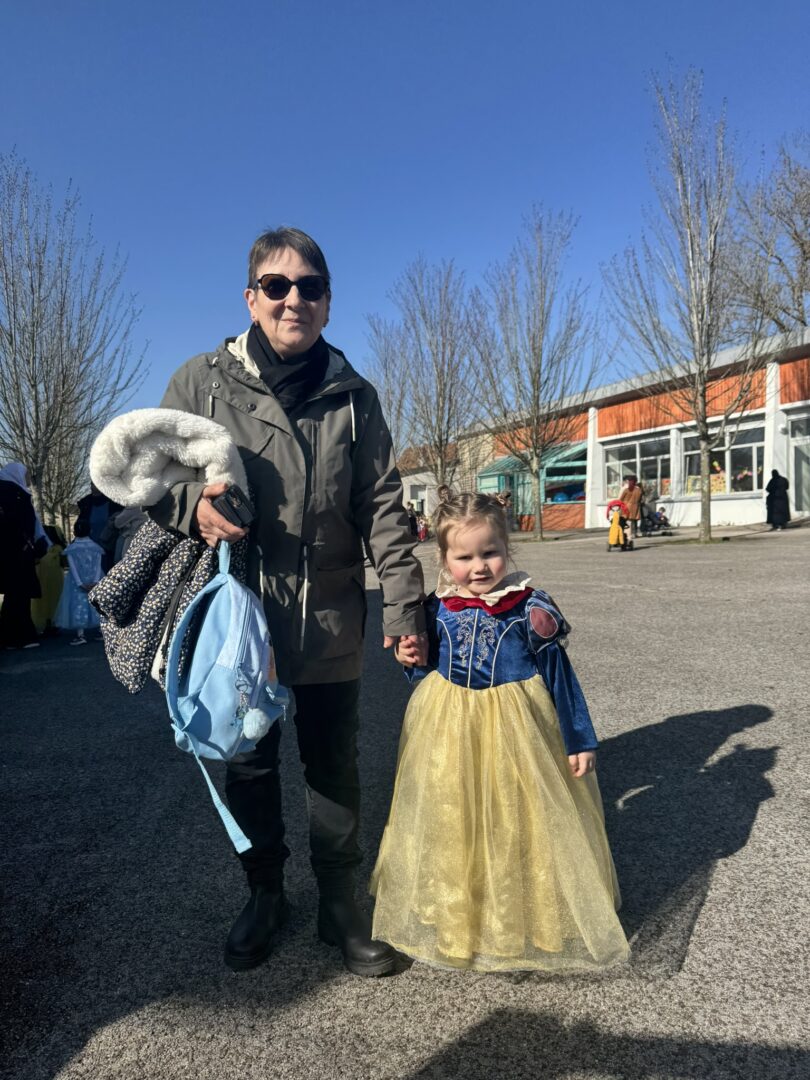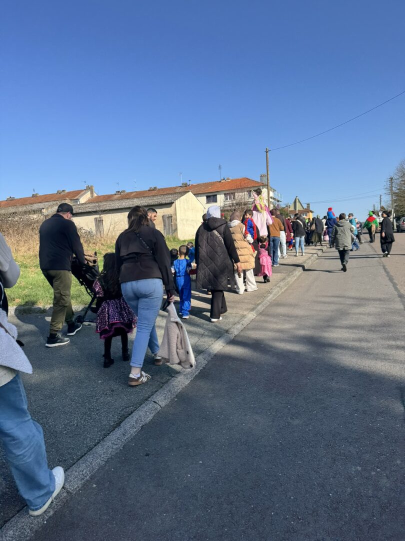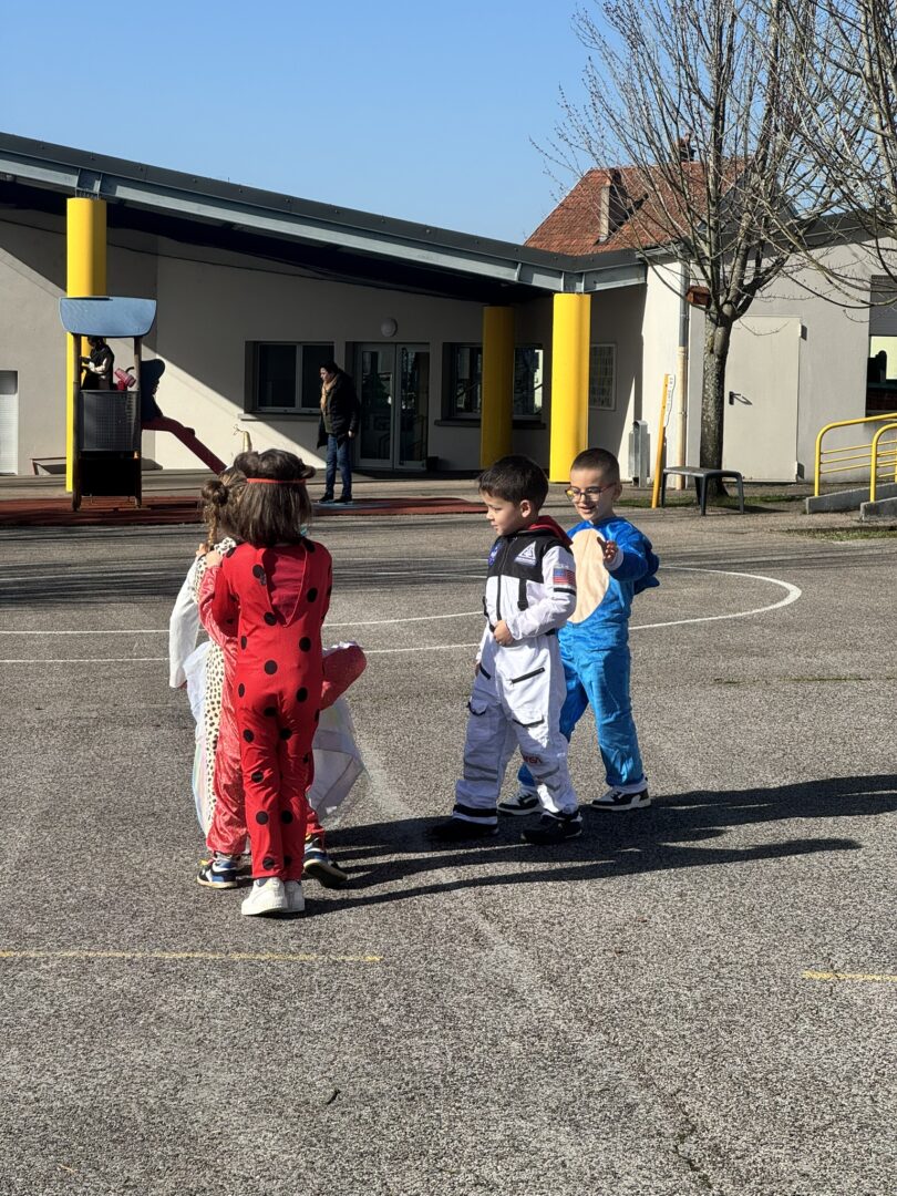 On est venus à l’école déguisés pour le carnaval. Avec les maîtresses, le maitre, les papas, les mamans, les tatas, les tontons… Nathalie, Inès et Marius, on a défilé dans le quartier jusqu’à l’école des grands. Ils ont admiré nos beaux costumes ; nous leur avons chanté la chanson « la vie est un bal masqué ». Puis on est revenus à notre école.