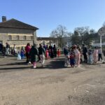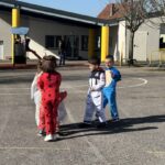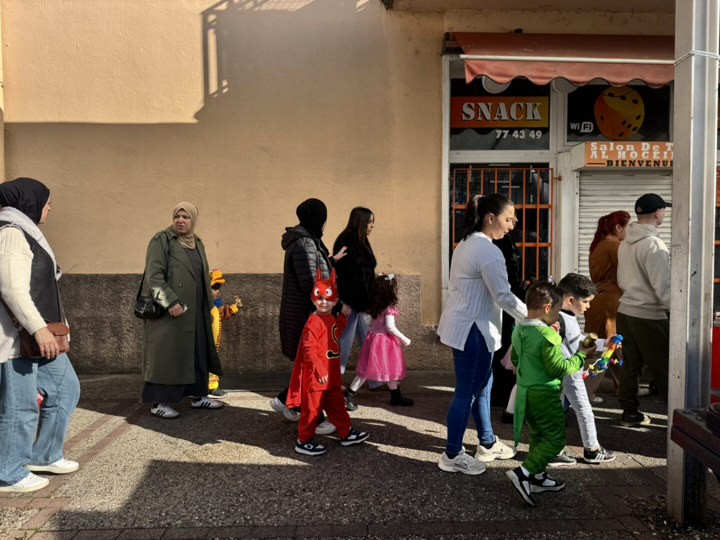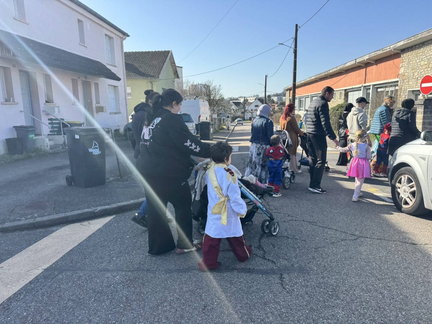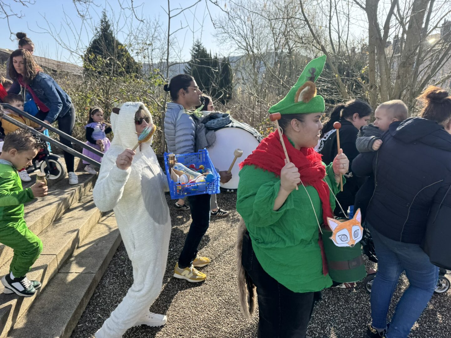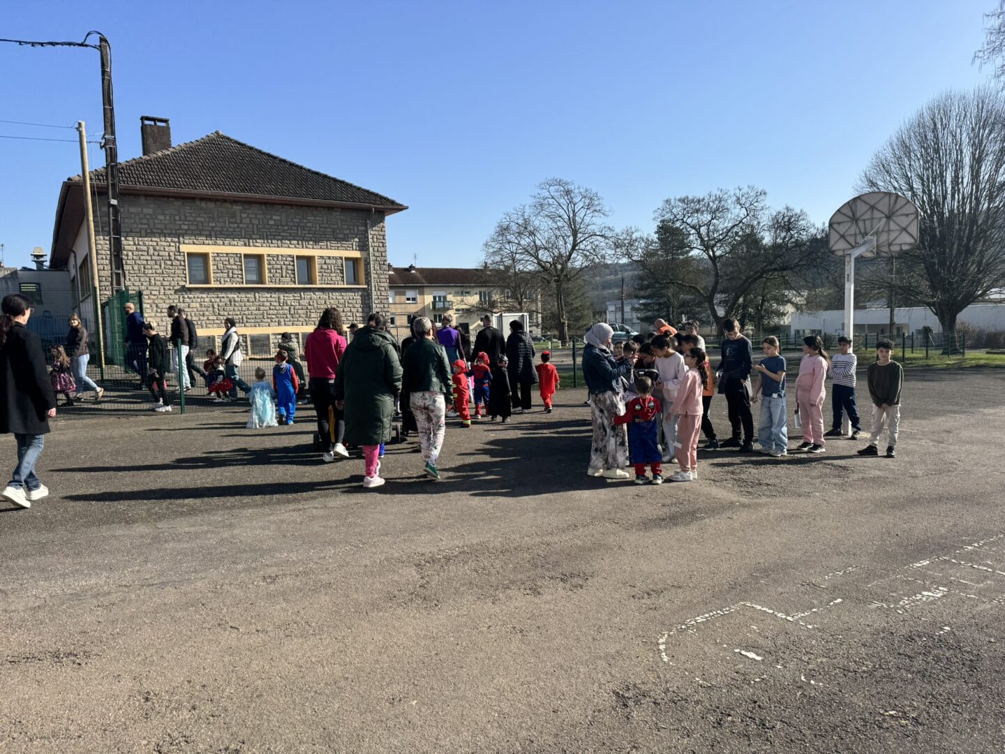 On est venus à l’école déguisés pour le carnaval. Avec les maîtresses, le maitre, les papas, les mamans, les tatas, les tontons… Nathalie, Inès et Marius, on a défilé dans le quartier jusqu’à l’école des grands. Ils ont admiré nos beaux costumes ; nous leur avons chanté la chanson « la vie est un bal masqué ». Puis on est revenus à notre école.